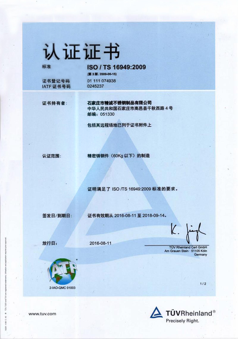 石家莊市精誠不銹鋼制品有限公司,是一家從事專業精密鑄造的企業。主要生產不銹鋼、合金鋼、低碳鋼及各種特種合金材質的精密鑄件及加工產品。